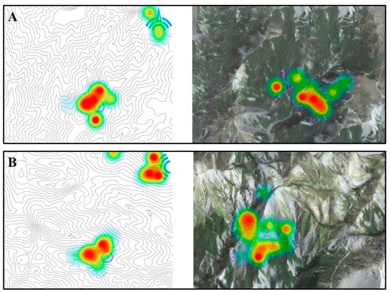 Fixation hotspot differences during terrain symbol representation tasks across map orientations. Note: (A) Normal orientation (B) Rotated orientation.