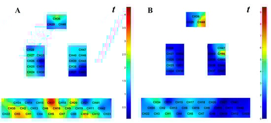 t-value activation maps of HbO2β values during terrain symbol representation tasks across map orientations. Note: (A): Normal orientation; (B): Rotated orientation.