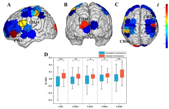 Paired-samples t-test results demonstrated significantly lower activation levels under normal orientation compared to rotated orientation across multiple channels: CH1 [t = −4.924, p < 0.001, PFDR < 0.001, Cohen’s d = 0.086]; CH25 [t = −4.162, p < 0.001, PFDR = 0.001, Cohen’s d = 0.063]; CH34 [t = −3.173, p = 0.002, PFDR = 0.019, Cohen’s d = 0.077]; CH46 [t = −3.383, p < 0.001, PFDR = 0.012, Cohen’s d = 0.058]; and CH48 [t = −4.109, p < 0.001, PFDR = 0.001, Cohen’s d = 0.080]. This indicates significantly reduced activation in R-DLPFC, L-PL, R-PL, R-TL, and VC during normal orientation. See Figure 6.