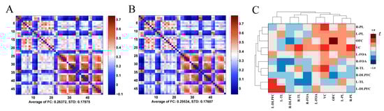 Functional connectivity results indicated an FC strength of 0.264 for the normal orientation and 0.295 for the rotated orientation. Paired-samples t-test results demonstrated significantly greater overall functional connectivity strength in the rotated orientation compared to the normal orientation [t = 32.780, p < 0.001, Cohen’s d = 0.415], as shown in Figure 7A,B. Region-based analysis revealed no statistically significant differences in FC strength for either inter-regional or homologous connections between tasks (p > 0.05), illustrated in Figure 7C.