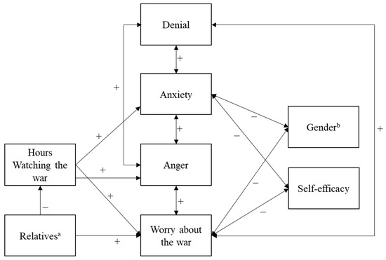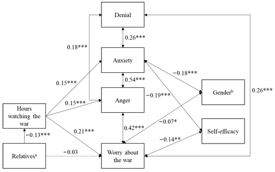 An examination of the standardized path coefficients showed that having relatives or friends in the Ukraine or Russia was correlated with more hours spent watching the war. In turn, the number of hours spent watching the war was positively associated with emotional reactions, such as war worry, anger, and anxiety, when watching the war. Emotional reactions, such as anxiety, anger, and war worry, were positively interrelated, as was denial, which was used as a coping strategy. However, self-efficacy as a coping strategy was negatively related to anxiety and war worry when watching the war. Also, anxiety and war worry were higher in women than in men.