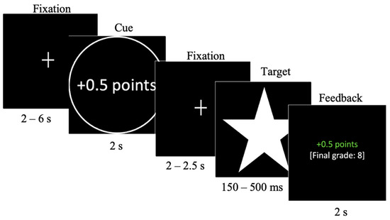 Reward sensitivity can be measured at the neural level using the Monetary Incentive Delay (MID) task (Knutson et al., 2001). The task differentiates between the neural response to (a) the anticipation of gain or loss and (b) the outcome where participants receive said monetary gain or loss (Knutson et al., 2000). This task triggers robust neural responses during the anticipation of monetary gains and losses (Wu et al., 2014), including in the striatum, insula, amygdala, and thalamus (Oldham et al., 2018), which are core brain areas for reward processing (Liu et al., 2011). Moreover, during the receipt of reward, the task activates the medial orbitofrontal cortex (mOFC) and dorsal anterior cingulate cortex (dACC) for both gains and losses (Chen et al., 2022). However, in an academic context, the main source of reward comes from school grades, and these grades act as an important source of external motivation for students (Koenka et al., 2021; Stan, 2012). Therefore, to obtain a more ecologically valid measure of reward in educational contexts, we modified the MID task to a School Grade Incentive Delay (SGID) task.