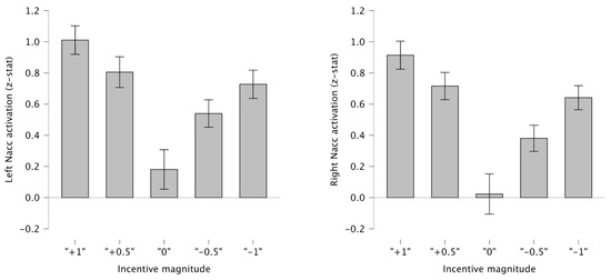 Figure 3. Parametric modulation of nucleus accumbens activation by incentive magnitude during reward anticipation. Bars represent mean activation (with SEM) for the five incentive magnitudes (−1, −0.5, 0, +0.5, +1 points).