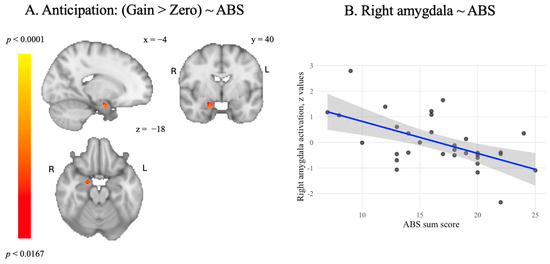 Figure 5. (A): results of the association between ABS scores and activation for the anticipation of reward, small-volume TFCE-corrected at p < 0.0167. (B): scatterplot illustrating the association (blue line) and 95% confidence interval (grey area) between ABS scores and right amygdala activity when anticipating a re-ward.