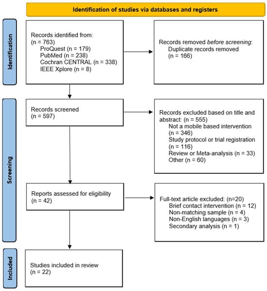 In total, 597 articles were identified through the database searches after removing duplicates (Figure 1). After screening of titles and abstracts, 555 articles were excluded based on the predefined eligibility criteria. Of the 42 articles extracted for full-text review, 20 were excluded for the following reasons: 12 involved brief contact interventions (e.g., SMS or telephone check-ins) rather than structured mobile applications, four targeted stakeholders or caregivers (e.g., parents) instead of individuals at risk for suicide, and three were published in non-English languages. Additionally, although McGillivray et al. (2023) met all inclusion criteria, they were excluded because they constituted a secondary analysis of data already included in Torok et al. (2022), and the inclusion of both studies would have resulted in duplicate data, violating the assumption of independence.