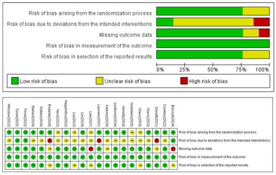 A risk of bias assessment was conducted for all included studies using the tools recommended by the Cochrane Collaboration. The Risk of Bias 2 (RoB 2) tool was applied to 21 RCTs, and one nonrandomized study was assessed using the Risk of Bias in Nonrandomized Studies of Interventions (ROBINS-I).