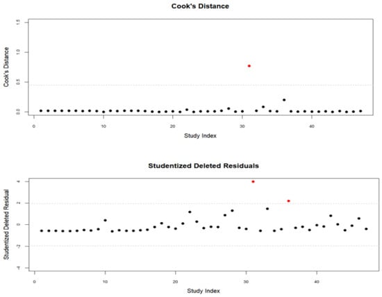 Scatterplots showing the distribution of the values for Cook’s Distance and Studentized Deleted Residuals. Red dots = outliers; Black dots = included studies.
