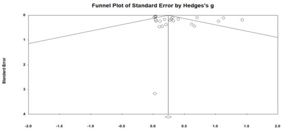 Significant variation was also found across treatment lengths (Q (6) = 27.42, p < 0.00). Interventions lasting 12 weeks yielded the largest effect size (k = 7, g = 0.61, 95% CI [0.11, 1.11]). In contrast, interventions lasting 8 weeks (k = 4, g = 0.80, 95% CI [−1.17, 2.27]), six weeks (k = 4, g = 0.12, 95% CI [−0.11, 0.35]), and 4 weeks (k = 8, g = 0.10, 95% CI [−0.01, 0.21]) yielded nonsignificant results, as their confidence intervals included zero. Studies with treatment durations of 2, 24, and 48 weeks were excluded because each study contributed only to a single effect size (k = 1), preventing a reliable subgroup estimation.