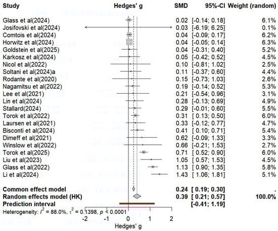In most studies, pre- and post-intervention means and standard deviations for the experimental and control groups were available and converted into Hedges’ g for analysis. In two studies (Bisconti et al., 2024; Josifovski et al., 2024), only ANOVA results were reported; therefore, the F values were transformed into Hedges’ g. All effect size conversions were performed using Comprehensive Meta-Analysis (CMA) version 4.0. For Goldstein et al. (2025), subgroup means and standard deviations were not reported; thus, the corresponding author was contacted and the necessary data were obtained directly. Individual study characteristics and effect sizes are tabulated in the summary tables, including details of participants, interventions, comparators, outcomes, and study design.