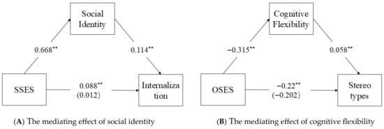 To further elucidate the mechanisms underlying the relationship between socioeconomic status and moral reasoning, we conducted mediation analyses examining the roles of social identity and cognitive flexibility. The results revealed distinct mediating pathways for SSES and OSES.