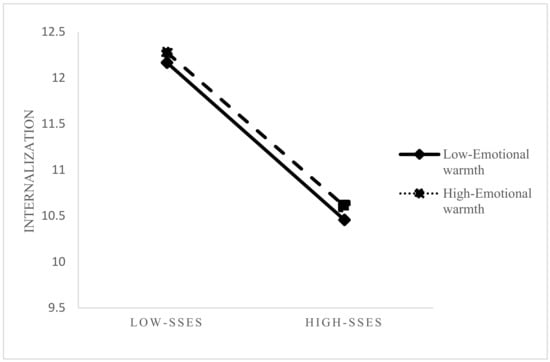 Contrary to our initial hypothesis, the analysis revealed unexpected patterns in the moderating role of parenting styles. As presented in Model 3 (Table 1), while the interaction between SSES and parental emotional warmth showed statistical significance in predicting moral internalization (β = 0.012, p < 0.05), the direction of this relationship contradicted our theoretical expectations. Simple slope analysis (Figure 2) demonstrated that: Across all levels of parental emotional warmth, higher SSES was associated with decreased moral internalization. The negative relationship between SSES and moral internalization was slightly attenuated (but not reversed) under conditions of high emotional warmth. The protective effect of emotional warmth was insufficient to overcome the overall negative SSES–moral internalization association.