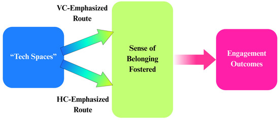 Belongingness as a key element. While cultural value orientations shape the general tendencies of engagement, belongingness—or a sense of belonging—plays a critical role in determining how individuals respond to specific environments. Belongingness acts as a psychological lens through which individuals interpret the relevance, legitimacy, and accessibility of participation (Boyd et al., 2024). In both VC and HC contexts, the desire to belong should motivate technology engagement; however, the pathways may differ. For VC learners, as noted above, belonging is often affirmed through performance within structured hierarchies: formal recognition, academic and professional achievement, or expert validation. By contrast, HC learners often experience belonging through peer recognition, community affirmation, and contributions to collective well-being of the community members. In that sense, focusing on the sense of belonging helps “translate” broader emphases in cultural value orientations into personally meaningful engagement. The proposed model, therefore, considers belongingness as a process rather than an outcome leading to technological engagement. It should be noted here that belongingness is not norm-neutral; rather, what constitutes “legitimate participation” is contextually produced through such means as classroom practices and policies (Barton & Tan, 2010; Nasir & Hand, 2008).