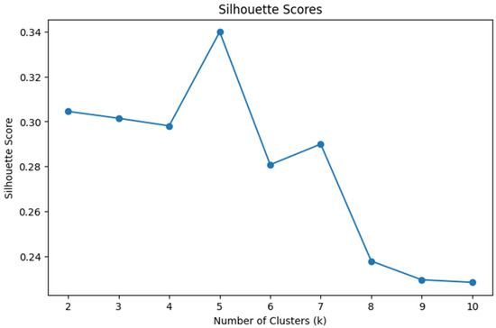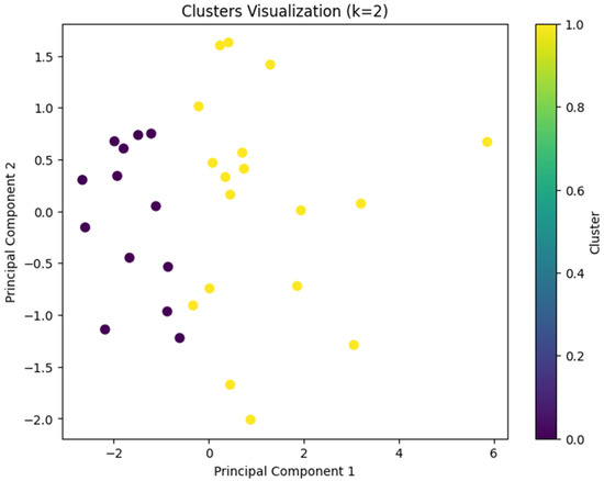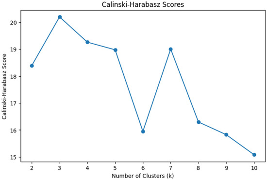 Cluster analysis was conducted using Python (Version 3.10; Python Software Foundation, 2023) in Google Colab (Google, 2024). We first cleaned the dataset by handling missing values through mean imputation. Numerical variables including interaction with content, instructor, system, and exam scores were standardized to ensure comparability. To obtain the optimal number of clusters, we performed K-means clustering ranging from two to ten clusters. We used Silhouette score and the Calinski-Harabasz index for assessing the model’s performance. The silhouette score indicates how well each data point fits within its cluster, balancing cohesion and separation. The Calinski-Harabasz score evaluates cluster compactness and the degree of separation between them, with higher values indicating better defined clustering structures. Those two serve as internal validation metrics. To explore student engagement behavior patterns, we applied k-means clustering using five key features: interaction with content, instructor, system, total interaction, and course exam scores. The Silhouette score (see Figure 1) peaks at k = 5 and Calinski-Harabasz index (see Figure 2) peaks at k = 3. Both have a reasonably high score when k = 2. Due to the small sample size of the dataset (n = 31) and the simplicity and interpretability of the results, we concluded that two clusters would be optimal and allow us to retain the interpretable solution and meaningful group differences. We used principal component analysis (PCA) to visualize the clusters (see Figure 3).