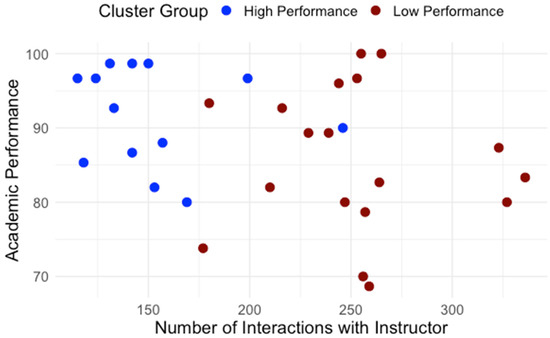 Figure 4 illustrates that both groups showed spikes in LMS activity around key assessments—week 3 (first assignment), week 5 (midterm exam), and week 7 (group project)—indicating that assessments served as primary engagement drivers. However, low-performing students tended to engage more frequently but in a reactive manner, with activity concentrated around deadlines and tapering off afterward. In contrast, high-performing students demonstrated more stable and consistent engagement patterns throughout the semester, suggesting a more proactive and sustained approach to learning.