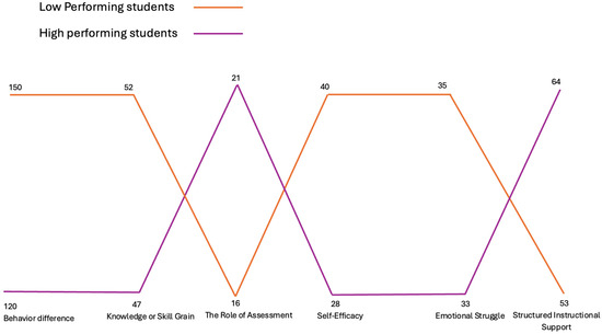 We further contextualized these differences using interview data. Six major themes emerged from the qualitative analysis (Figure 9): behavioral differences in engagement, the role of assessment, emotional struggle, self-efficacy, knowledge or skill gain, and structured instructional support. Table 2 provides brief definitions and representative quotes for each theme.
