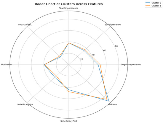 Figure 10 complements these findings by visualizing average post-survey scores across key domains. The radar chart shows that while both groups reported comparable outcomes in motivation, teaching presence, and cognitive presence, low-performing students had slightly elevated perceptions of social presence and PBL impact. This visualization reinforces the pattern that although academic performance differed, students with initially lower scores experienced notable gains in affective and cognitive domains.