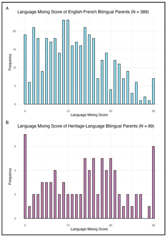 Language Mixing Scale scores distribution across (A) French-English and (B) heritage-language bilingual participants. The x-axis represents the Language Mixing Scale score, which ranges from 0 (no language mixing) to 30 (frequent language mixing), while the y-axis shows the number of parents who reported each score on the Language Mixing Questionnaire (LMQ).