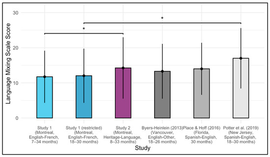 Language Mixing Scale scores across studies (Byers-Heinlein, 2013; Place & Hoff, 2016; Potter et al., 2019). The y-axis depicts the Language Mixing Scale score, which ranges from 0 (no language mixing) to 30 (frequent language mixing). Vertical lines represent one standard deviation above and below the mean in each sample. Horizontal lines indicate statistically significant comparisons based on age-matched samples (* p < 0.05). Although additional comparisons were conducted for the unrestricted Study 1 sample, these are not shown in the figure as they did not account for child age.