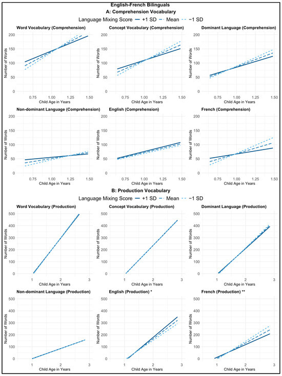 Interaction between child age and language mixing score on vocabulary development among French-English bilinguals, for (A) comprehension vocabulary measures and (B) production vocabulary measures. The x-axes represent child age in years, and the y-axes represent the number of words understood (A) or spoken (B). Each graph shows predicted vocabulary growth with age for children whose parents’ Language Mixing Scale score was at the sample mean (dashed line), 1 standard deviation above the mean (solid line), and 1 standard deviation below the mean (dotted line). * p < 0.05, ** p < 0.01 indicate significant interactions between child age and language mixing score.