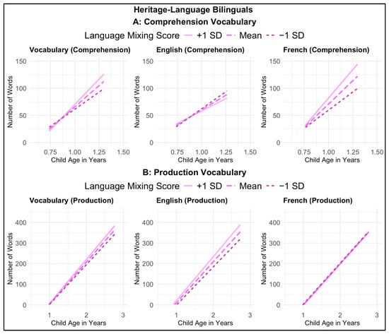 Finally, our studies only examined French and English vocabulary development, as we did not have data on heritage language vocabulary size. Future work should examine vocabulary development in the heritage language, rather than focusing solely on societal languages. Some prior work has found negative relationships between parental language mixing and children’s heritage language outcomes (Place & Hoff, 2016; Verhoeven et al., 2025). Thus, it is possible that parental language mixing influences heritage-language development differently than societal-language development. Understanding whether and how mixing supports or hinders vocabulary growth in the heritage language is essential, particularly for efforts to support heritage language maintenance in multilingual families.