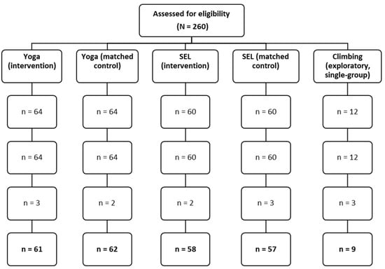 A total of 260 primary school children (Grades 3–4; ages 8–9 years) participated across three formats: Yoga (n = 64) with a class-matched control (n = 64), SEL (n = 60) with a class-matched control (n = 60), and an exploratory single-group Climbing arm (n = 12) in a special-education context.