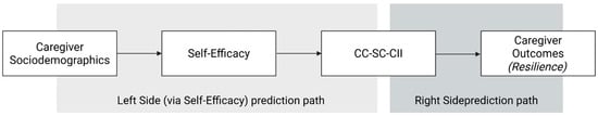 Theoretical model guiding the study. The left side of the model illustrates the hypothesized indirect effects of caregiver sociodemographic and clinical variables on caregiver contribution to self-care via self-efficacy. The right side represents the direct associations between different dimensions of caregiver contribution (maintenance, monitoring, and management) and caregiver resilience outcomes.