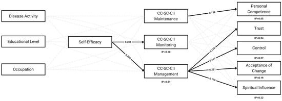 A path diagram combines two distinct structural equation models. Model 1 (Left-side) includes sociodemographic and clinical predictors (Disease Activity, Educational Level, Occupation) influencing Self-Efficacy, which in turn predicts CC-SC-CII Maintenance, Monitoring, and Management. Model 2 (Right-side) examines how these CC-SC-CII dimensions are associated with five facets of resilience (Personal Competence, Trust, Control, Acceptance of Change, and Spiritual Influence). Solid lines represent statistically significant standardized paths (p < 0.05), while dashed lines indicate non-significant paths. Coefficients are shown for significant associations.
