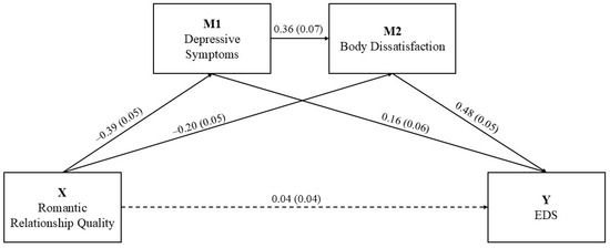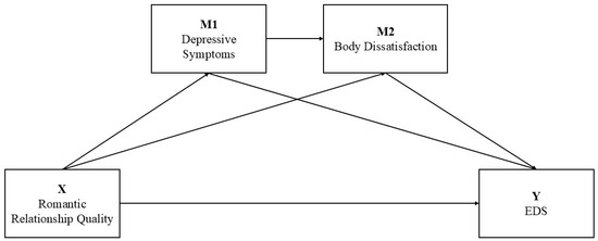 Depressive symptoms and body dissatisfaction would operate as serial mediators in the association between romantic relationship quality and EDS. Specifically, lower relationship quality would be associated with greater depressive symptoms, which in turn would predict increased body dissatisfaction, ultimately leading to higher levels of EDS.