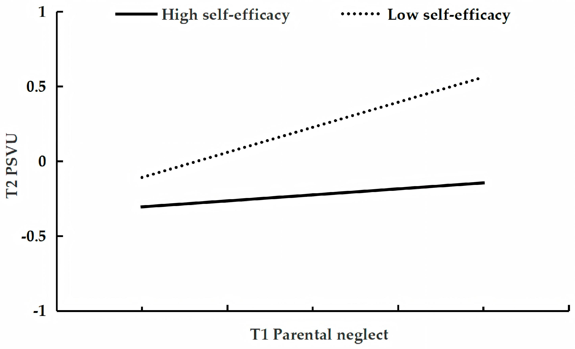 T1 Parental neglect × T1 Self-efficacy | −0.10 *** | 0.03 | −3.47 | <0.001 | −0.16 | −0.05 |