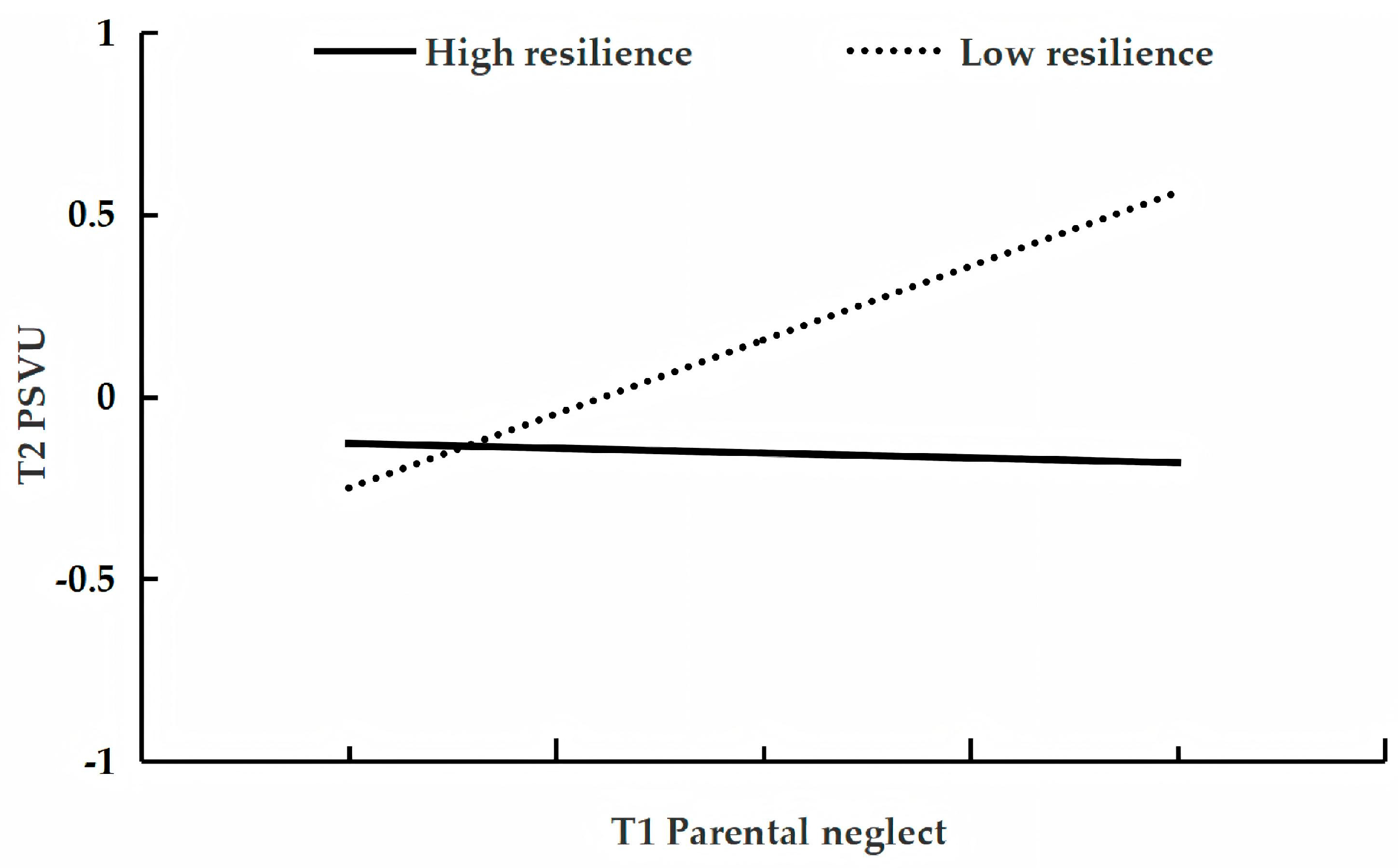 T1 Parental neglect × T1 Resilience | −0.17 *** | 0.03 | −5.97 | <0.001 | −0.22 | −0.11 |