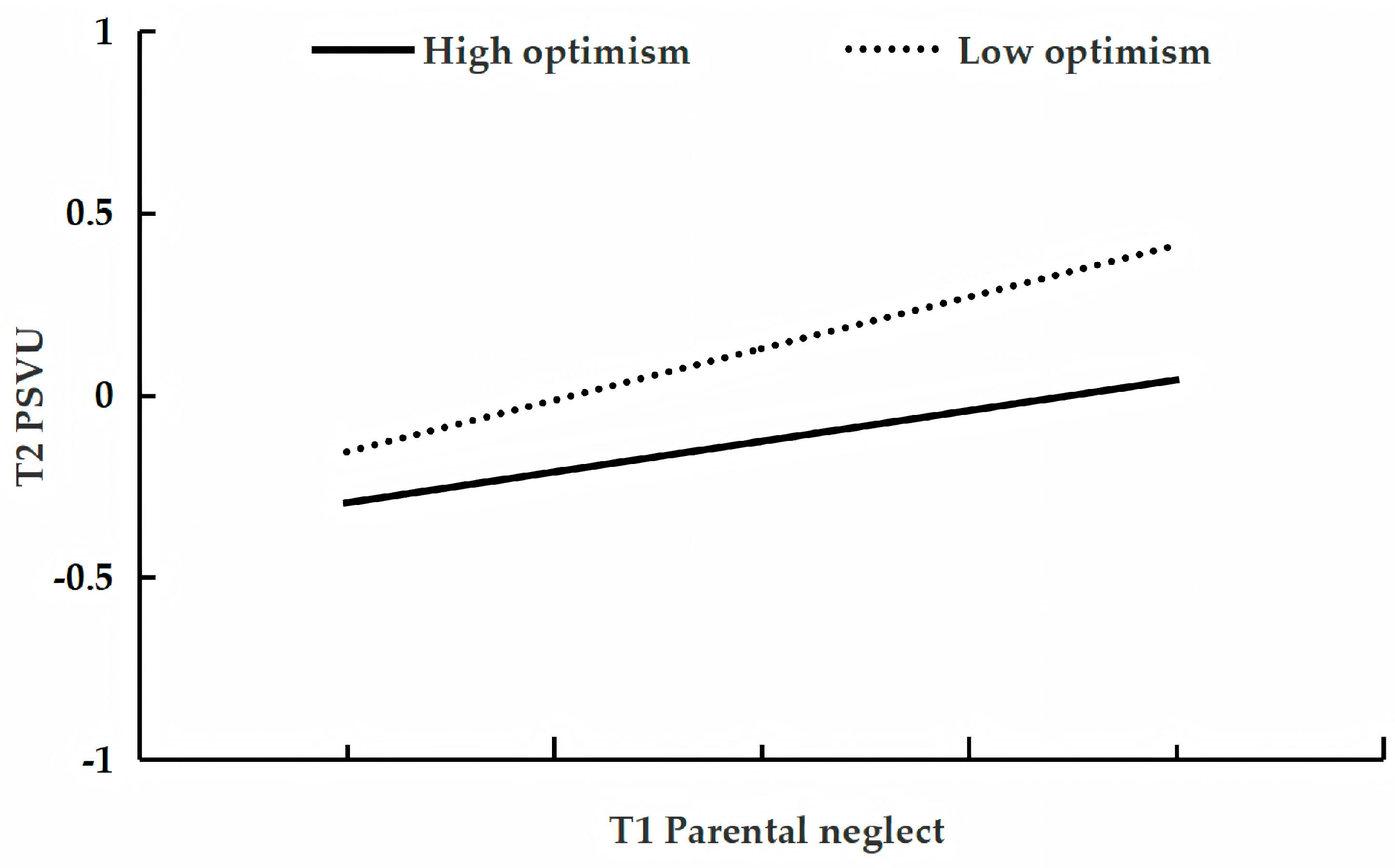 T1 Parental neglect × T1 Optimism | −0.05 | 0.03 | −1.68 | 0.09 | −0.12 | 0.01 |