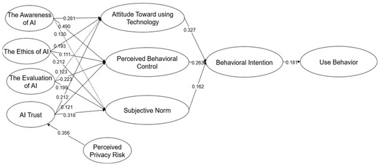 Awareness of AI positively influences users’ Perceived Behavioral Control (AWA → PBC).