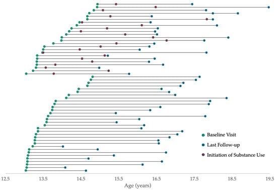 Participants included in this sample represent a subset of participants from a larger longitudinal MRI project (n = 81). Data included in the analyses were from participants who met the eligibility criteria and had high-quality structural and functional MRI data, with a final sample size of n = 56 with 24 participants reporting substance use during follow-up. Duration of follow-up was not significantly different between initiators and non-initiators, F(1,54) = 0.345, p = 0.559. Baseline ages, ages of final follow-up data and ages of substance use initiation are depicted in Figure 1. Given the wide range of follow-up durations, no direct contrasts of initiators versus non-initiator groups were conducted, given that participants lost to follow-up earlier may have gone on the initiate substance use. For participants who remained in the study until age 16 (n = 48), group comparisons are provided in the Supplementary Materials (Tables S1 and S2), showing no group differences in demographic variables or task performance variables between participants who initiated substance use prior to versus after age 16.