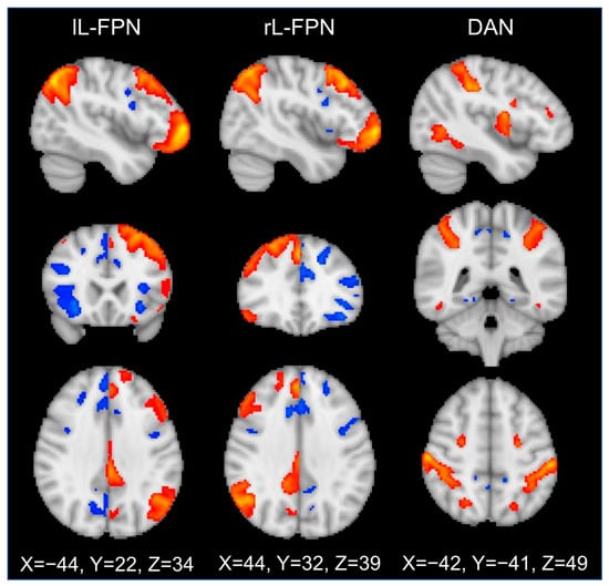 Template networks of interest, extracted from Human Connectome Project data (https://www.humanconnectome.org/study/hcp-young-adult, n = 1003, dimensionality = 50 components, HCP 1200 release date: 21 July 2017) for the left lateral frontoparietal network (lL-FPN), the right lateral frontoparietal control network (rL-FPN), and the dorsal attention network (DAN). Orange network areas activation is positively correlated over time, while blue regions show a significant negative temporal correlation with orange areas.