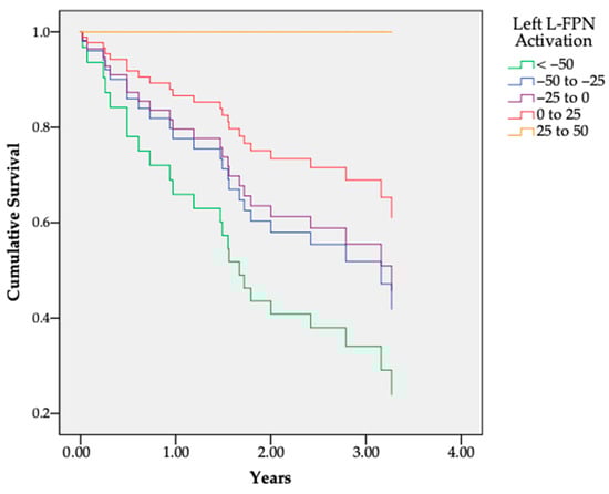 Sample survival curves for binned values left L-FPN activation on the Negative NoGo > Neutral NoGo contrast. Lower activation of this network was significantly associated with increased hazard for substance use initiation.