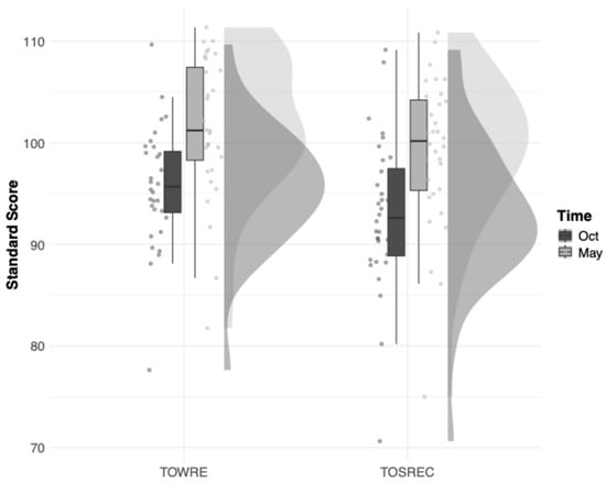 | TOWRE-2 October | 582 | 95.80 | 16.50 | 53 | 139 | −0.27 | 0.03 | 0.042 [0.007, 0.108] |