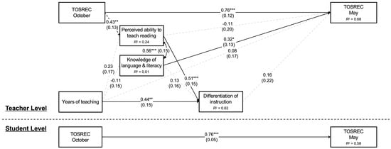 - Parrila, R., Inoue, T., Dunn, K., Savage, R., & Georgiou, G. (2024). Connecting teachers’ language knowledge, perceived ability and instructional practices to Grade 1 students’ literacy outcomes. Reading and Writing: An Interdisciplinary Journal, 37(5), 1153–1181. [Google Scholar] [CrossRef]