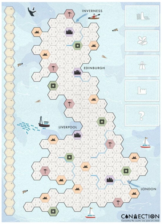 Two games, Connection (a game exploring the connections of Britain’s cities and green spaces with transport and power—see Figure 1) and New Town Power (a town-building game that focusses on the provision of utilities and transport links) were taken through several further rounds of playtesting by a group of students and, ultimately, after months of iterative design, were used to share our research with young players, finding audiences at a local secondary school, at the Manchester ESRC Festival of Social Science, and at the Bluedot science and music festival at Jodrell Bank Observatory in Cheshire.