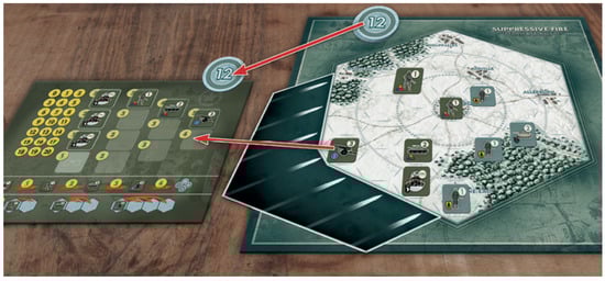 Accordingly, the rules of the game we made remain the same as the original, the only exception being that we determined that our version would be a two-player game to emphasise the combative nature of the original. Our actions were therefore limited to the renaming the various game mechanics and reflecting these changes with new artwork. We recruited Marc von Martial, a game artist with a track record of wargames design, to produce the board, tokens and rulebook, replacing all in-game assets with equivalents that evoked the aesthetics of traditional manual wargaming (hex grids, square die-cut tokens, recognisable historical units). The result was Suppressive Fire, a game in which seeds become military scouts, seedlings infantry, medium trees tanks, and large trees artillery (see Figure 2). What had once been the shadows cast by trees, was now the area subject to the suppressive fire of these various military units, a change from which the game took its new name. The rotation of the sun becomes the direction of suppressive fire, which prevents units from moving in certain directions and occupying useful vantage points. The woodland map itself became a battlefield, with the most valuable ‘soil’ replaced by strategically valuable locations. The ‘light point’ economy became a military economy, allowing players to purchase more units for deployment.