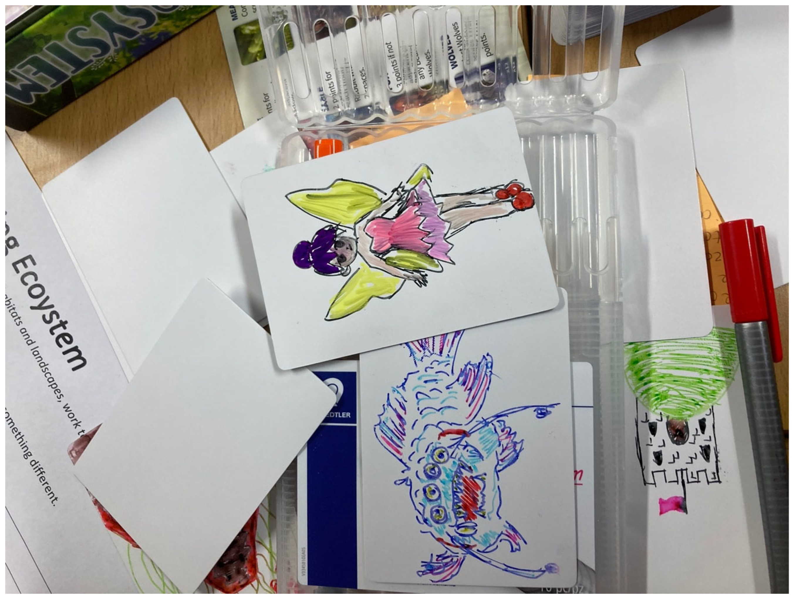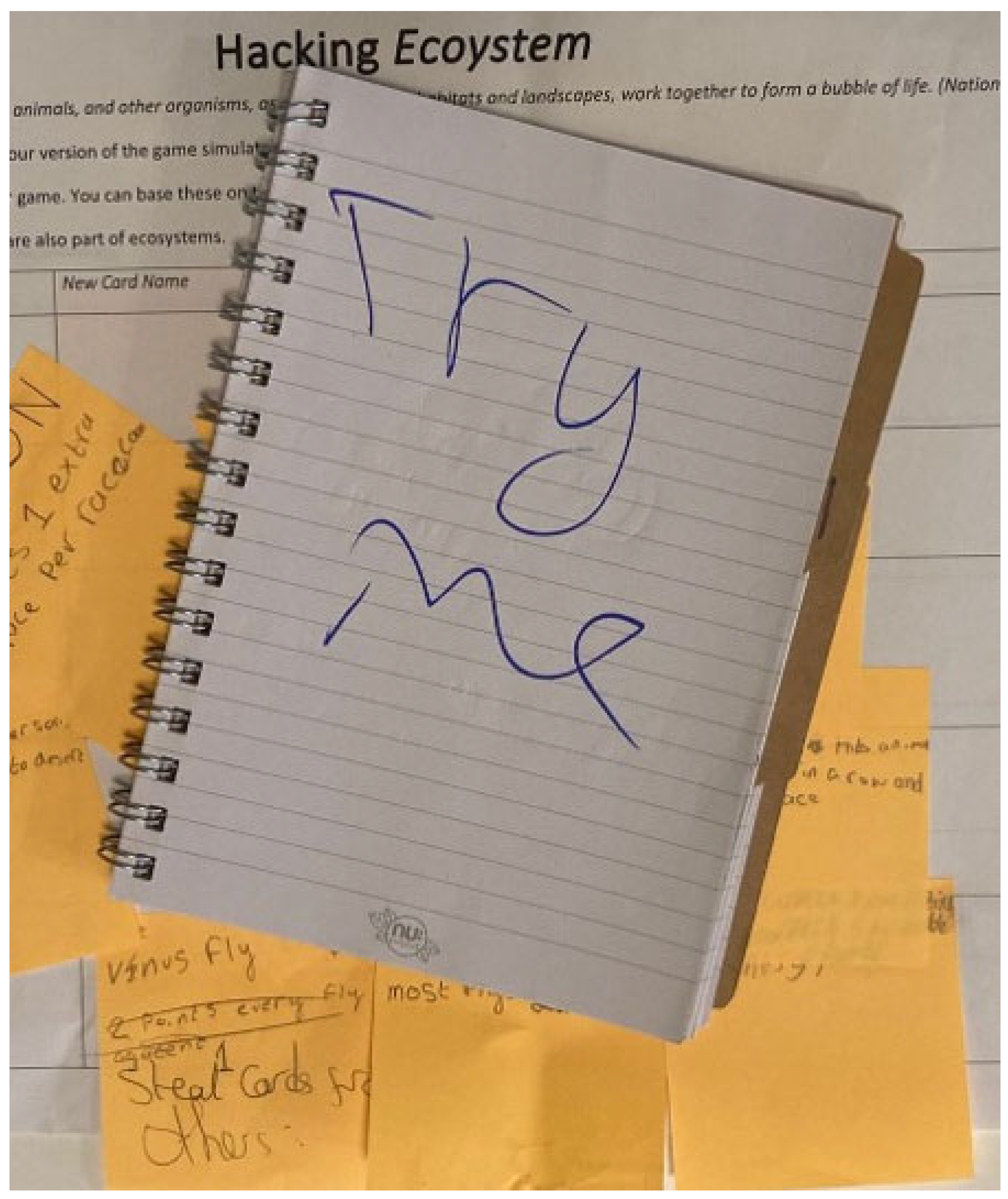 Rather than being productive of a design toolkit, or new, climate-conscious games, hacking became a way for participants to reflect on issues such as their perceived powerlessness in society, social conflict, and the seemingly inevitable inequalities that drive crisis. As participants ourselves within the research workshops, we reflected on the same issues alongside the young people. At the same time, as researchers engaged in participatory action research and conscious of funder expectations, of promises we had made regarding various publishable outputs, we reflected on an appropriate and ultimately invigorating powerlessness. As unicorns and hellsnails were added to serious games about planning ecosystems, and complex and ever-evolving roleplaying games emerged through the weekly sessions, we realised we ought not to anticipate outcomes for our sessions and that providing structure to the hacking both invited and deserved the irreverence with which the participants responded.