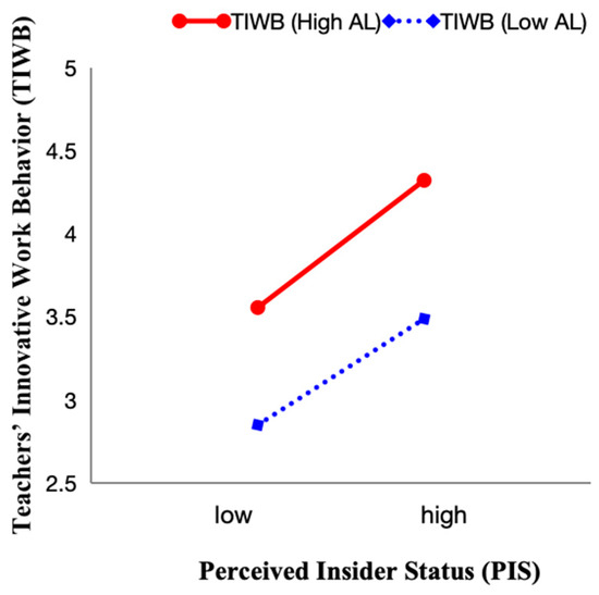 Model 2 regressed teacher innovative work behavior on well-being and found a significant positive effect (β = 0.483, p < 0.01), supporting H1. Beyond statistical significance, the explanatory power of the model also increased substantially, with R2 rising from 0.032 to 0.310. This indicates that teacher well-being explained 27.8% of the variance in innovative work behavior, highlighting its substantive contribution. Model 4 showed that teacher well-being positively predicted perceived insider status (β = 0.466, p < 0.01), supporting H2a. The explained variance increased by 21.9%, underscoring the role of teacher well-being as a strong predictor of perceived insider status. Model 6 confirmed that perceived insider status significantly predicted innovative behavior (β = 0.560, p < 0.01), supporting H2b. The R2 value rose from 0.032 to 0.277, showing that perceived insider status accounted for 24.5% of the variance in innovative work behavior. In Model 8, the interaction between perceived insider status and authentic leadership was significant (β = 0.243, p = 0.002 < 0.01), supporting H4. As illustrated in Figure 2, the positive relationship between insider status and innovation was stronger when principal authentic leadership was high.