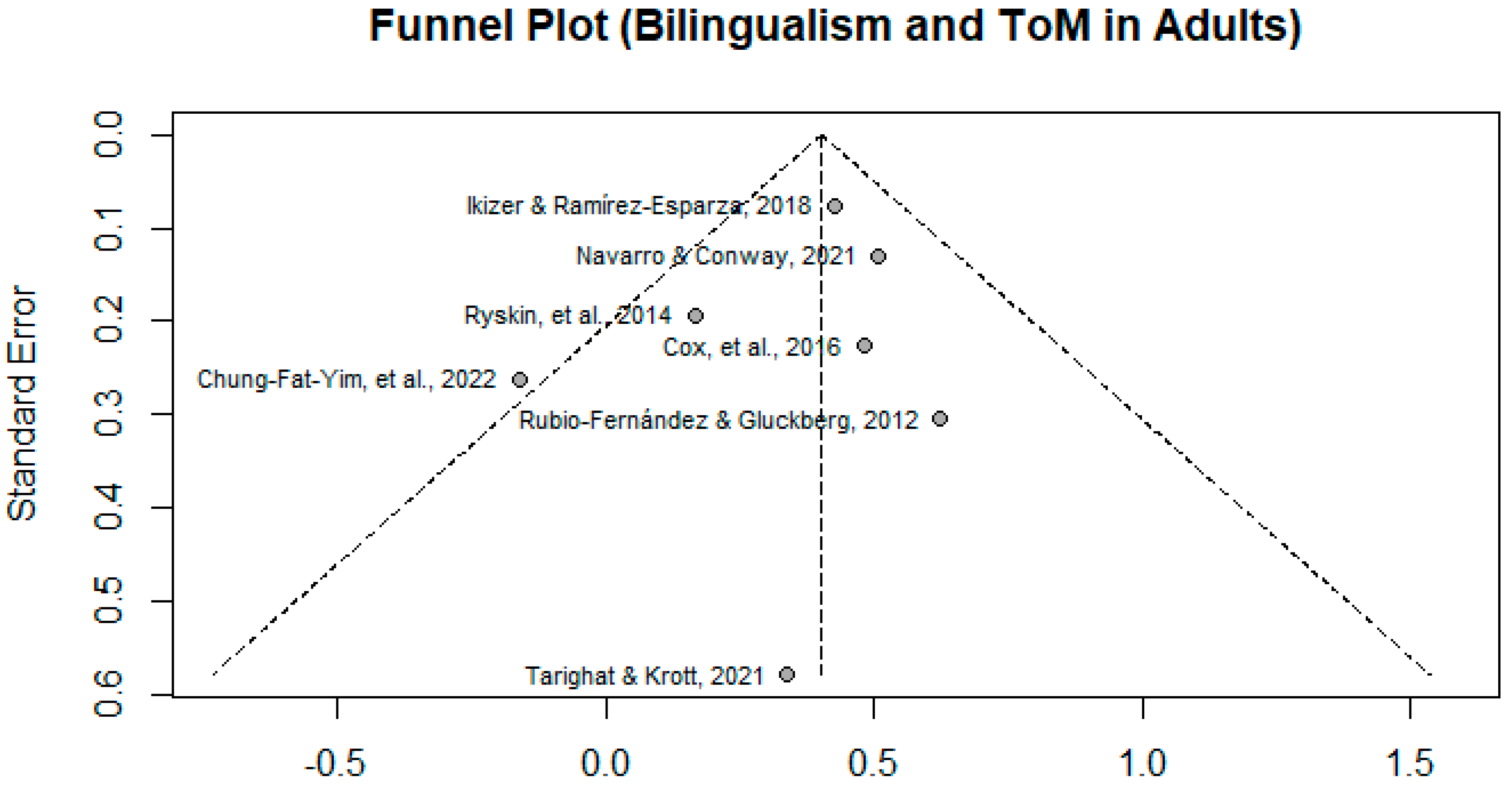 Cox et al. (2016) | Faux Pas Test | 64 | 26 | Bilingual = 74.54 Monolingual = 74.45 | No | 0.060 | 0.482 |