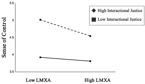 Interactional justice moderates the indirect effect of LMXA on emotional exhaustion via workplace sense of control, such that the mediated relationship is stronger when interactional justice is high rather than low.