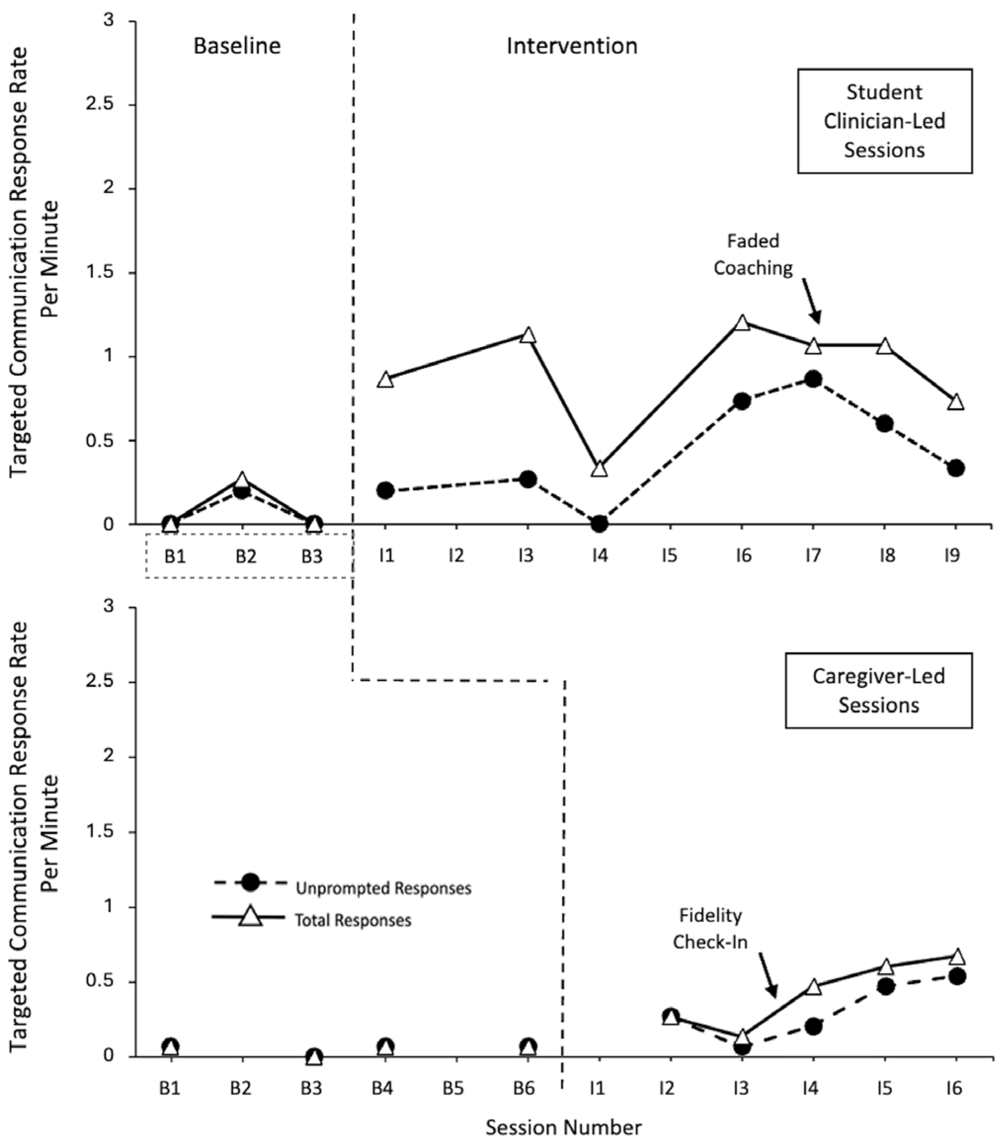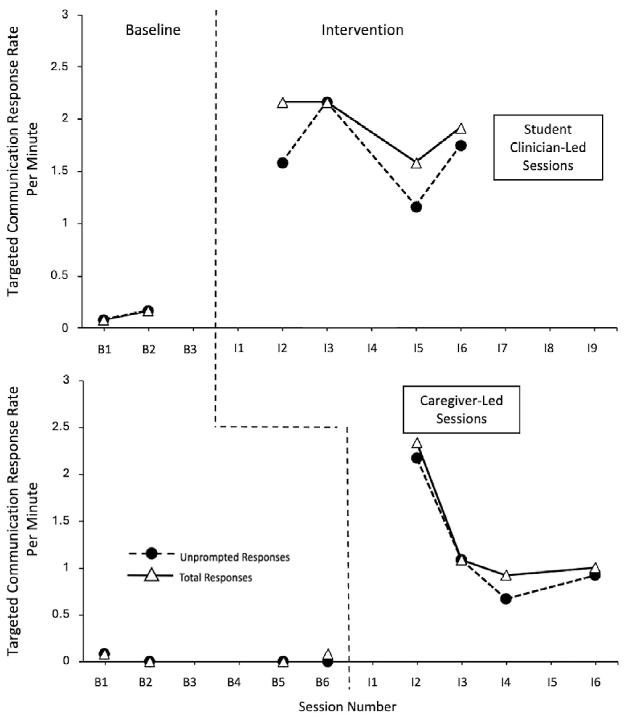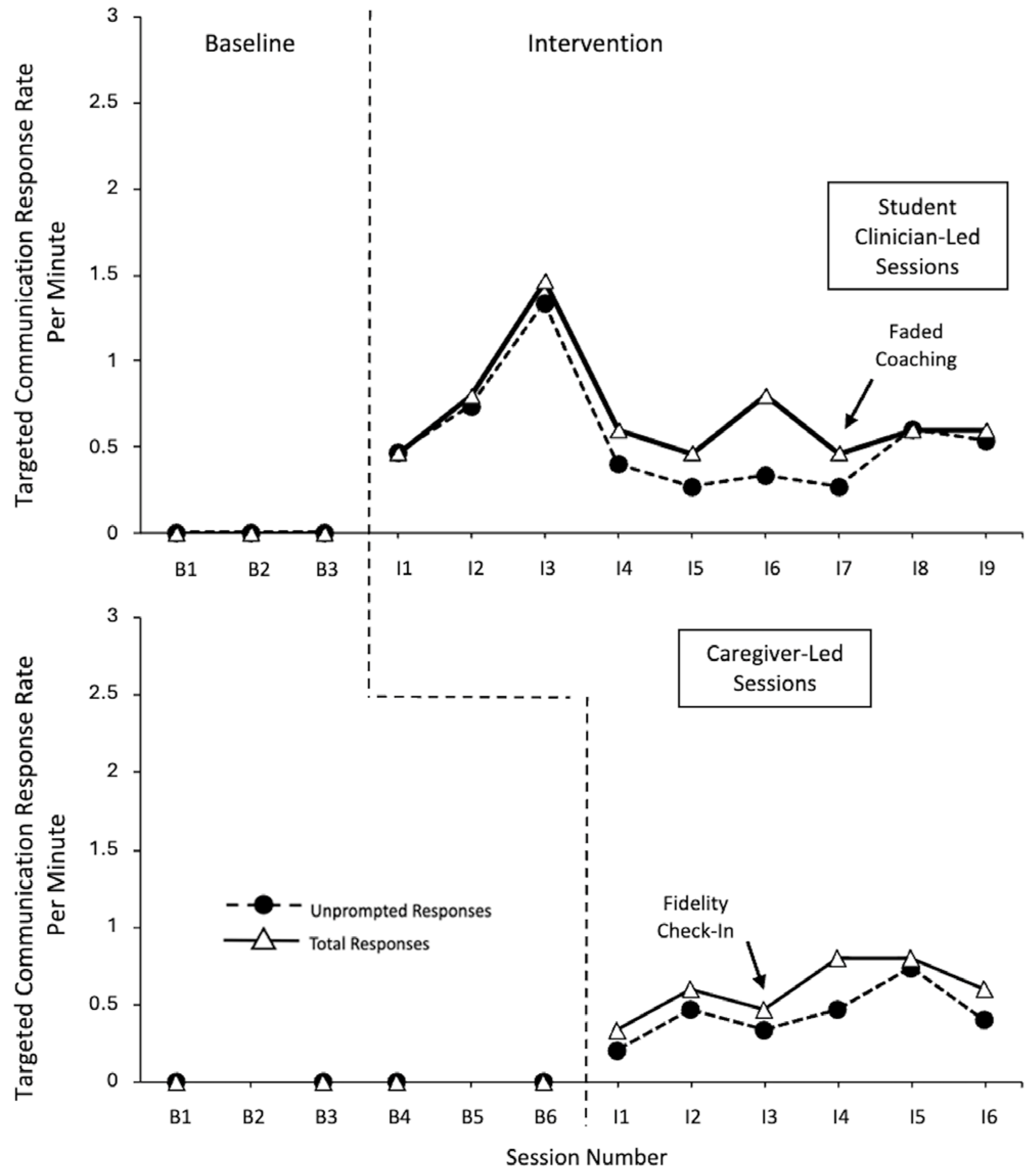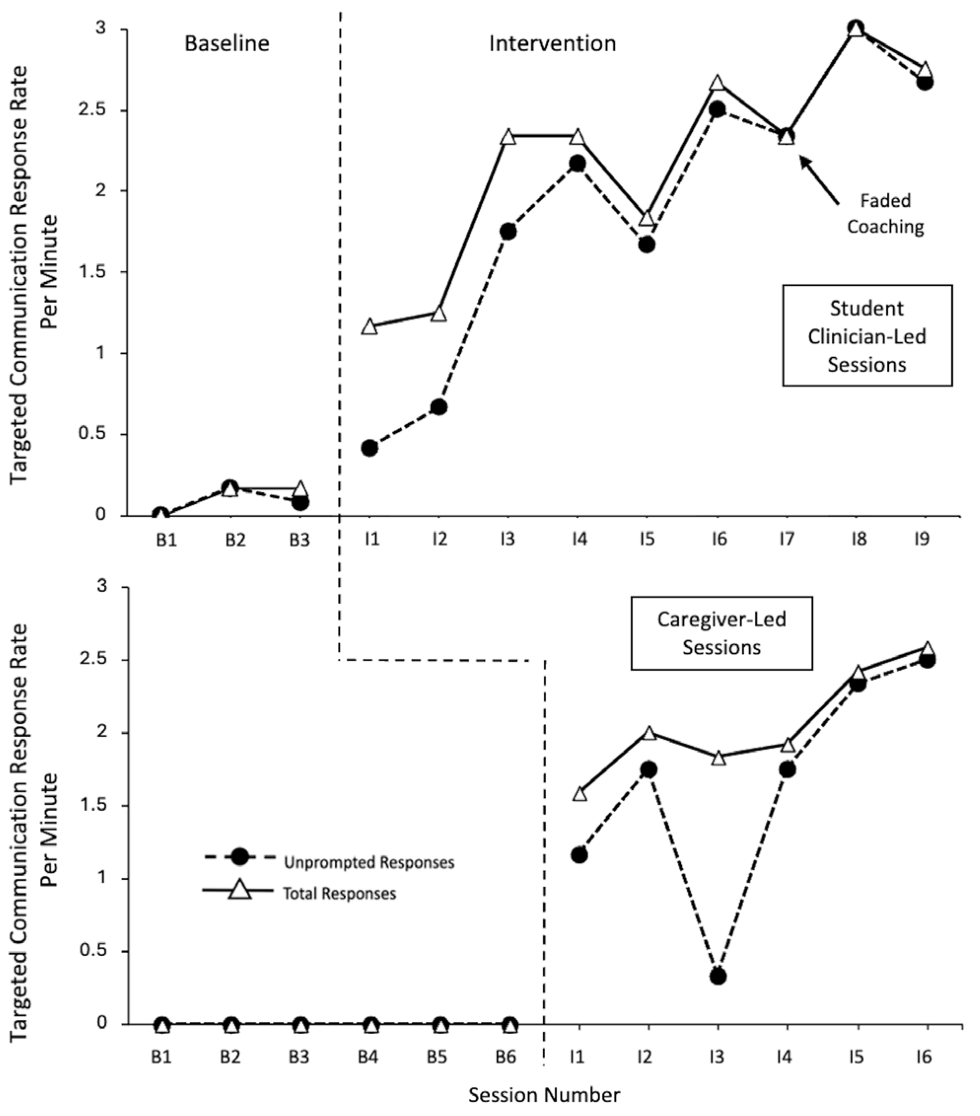 The rate per minute of total targeted communicative responses (prompted and unprompted), as well as unprompted communicative responses, were plotted across the baseline and intervention (coaching) phases. Visual analysis methods described by