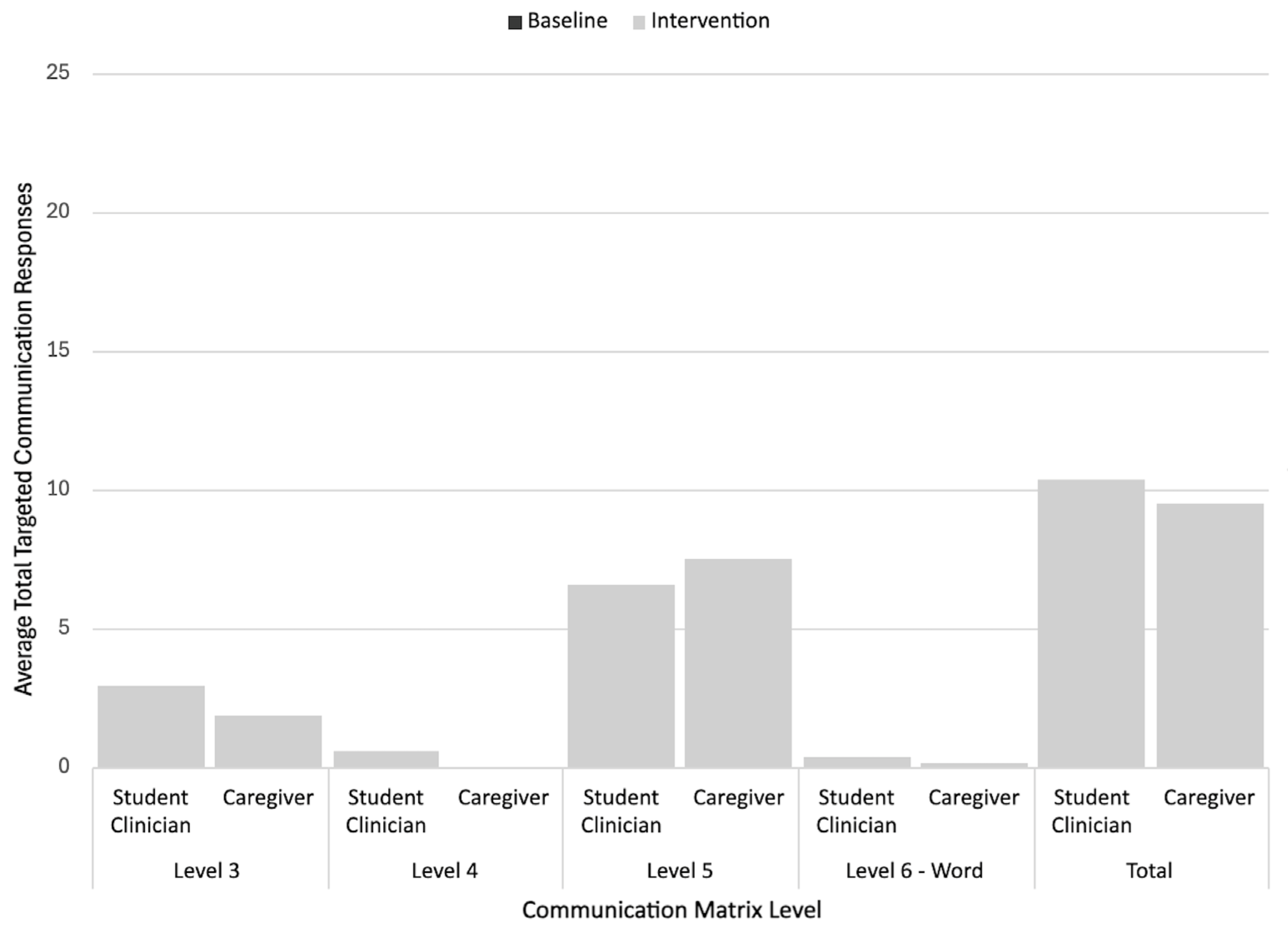 The primary dependent variables were the child’s (a) rate per minute of total targeted communicative responses (prompted and unprompted) to adult participant targeted communication temptations and (b) the child’s rate per minute of targeted unprompted communicative responses to targeted adult participant communication temptations. Secondary variables examined the rate of total communication responses across a given Communication Matrix level during the baseline and intervention sessions (for both student clinician-led and caregiver-led sessions). The Communication Matrix levels coded included: level III responses (unconventional communication), level IV responses (conventional gestures), level V responses (concrete symbols), and level VI responses (abstract words or signs). Level VI responses were further coded as either a vocal word or sign.