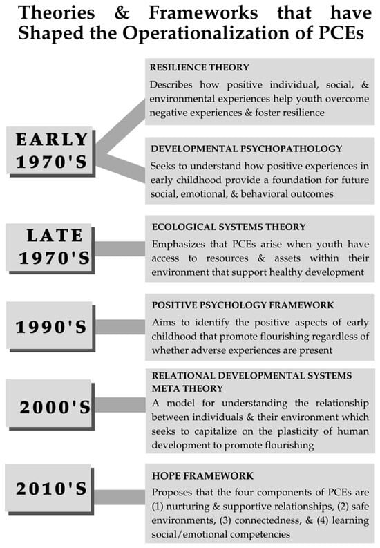 Resilience theorists in the 1970s laid the groundwork for defining PCEs by positing that researchers should understand the positive environmental, societal, and individual variables that disrupt maladaptive developmental trajectories (Masten, 2018). Consequently, resilience theorists began to diverge from the dominant deficit-based approach of the time that strongly emphasized the role of ACEs and, instead, turned toward a more strength-based approach. Resilience theorists then explored how PCEs act as protective factors by attempting to understand the unique individual, familial, and community-level factors that can promote resilience in the face of adversity (Shean, 2015). However, even within the resilience theory framework, there is often disagreement over which level(s) and which factor(s) operating at each level are integral to fostering child resilience. Some theorists believe positive family and social relationships to be the most crucial in fostering resilience, while others believe individual factors (e.g., temperament) may help to better understand the variable effects of PCEs (Shean, 2015). In recent years, resilience researchers have begun to describe resilience as a process that adapts over time, and the key positive factors that promote resilience may change over the course of one’s lifespan. For instance, in early childhood, parent–child quality time and close caregiver relationships are seen as crucial for fostering resilience and promoting child flourishing (Southwick et al., 2014; Waters et al., 2023). As an individual ages, however, they may start to draw strength from peers, friendships, role models, spirituality, or other resources available to the individual over time. In any case, resilience theorists across the board seem to agree on understanding how PCEs help youth overcome past traumatic experiences.