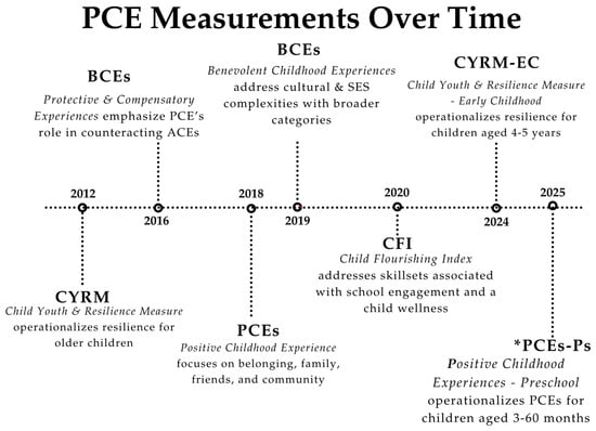 Existing theories and frameworks have not defined PCEs to be measured prospectively in preverbal children. With a concentration on developing a prospective instrument to capture PCEs during preverbal child development, we summarize the contributions of experts in the field of resilience and well-being (see Table 1) along with the historical timeline for the introduction of PCE measurements (Figure 2).
