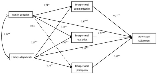 As shown in Figure 2, both family cohesion and family adaptability significantly predicted adolescent adjustment among senior high school students. They also influenced all dimensions of interpersonal competence (interpersonal communication, interpersonal perception, and interpersonal regulation), which in turn indirectly affected adolescent adjustment. The model further indicated that, even after including these dimensions of interpersonal competence as mediators, family cohesion and family adaptability remained significant positive predictors of adolescent adjustment, suggesting partial mediation by the dimensions of interpersonal competence in the relationship between family functioning and adolescent adjustment.