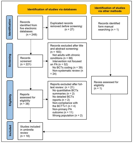 The study inclusion process for this umbrella review is presented in Figure 1. Initially, a total of 248 records were identified through electronic database searches. After removing 27 duplicate records, 221 were retained and subjected to title and abstract screening. During this stage, 183 records were excluded primarily because they did not meet the eligibility criteria. Following this stage, 38 records were selected for full-text review. During the full-text review, 21 reports were excluded based on predefined eligibility criteria. Additionally, one record was identified through manual searching, which met the eligibility criteria and was subsequently included in the review. Ultimately, 18 studies (Agirre-Elordui et al., 2024; Ashley et al., 2024; Carraca et al., 2021; Cooper et al., 2023; de Leeuwerk et al., 2022; Duff et al., 2017; Ester et al., 2021; Finne et al., 2018; Grimmett et al., 2019; Hailey et al., 2022; Hallward et al., 2020; Lin et al., 2022; Marley et al., 2017; Mbous et al., 2020; Meade et al., 2019; Meyer-Schwickerath et al., 2022; Willett et al., 2019; X. Zhang et al., 2024) were included in the umbrella review, ensuring that only those meeting the full inclusion standards were considered for analysis.
