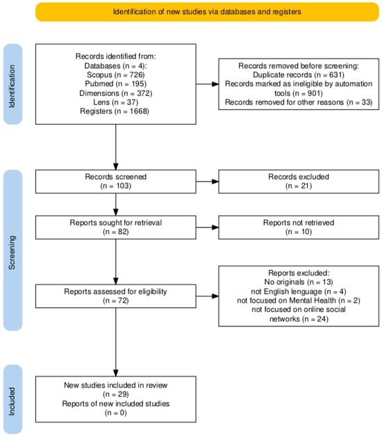 This systematic review and meta-analysis adhered to the Prefered Reporting Items for Systematic Reviews and Meta-Analyses (PRISMA) 2020 statement (Page et al., 2021). The databases Scopus, PubMed, Dimensions, and Lens were selected for their interdisciplinary relevance and technical coverage in the health sciences (Elsevier, 2019; Singh et al., 2020; Penfold, 2020; Paz-Pacheco, 2023). The search strategy employed Boolean operators—OR (to broaden results with related terms) and AND (to restrict them). Initially, the terms “risk factors” and “prevention” were linked with OR (in title, abstract, or keywords) and restricted using AND with “mental health” OR “mental disorder” OR “psychiatric disorders” OR “suicid” OR “self-harm.” Subsequently, social media terms (“social networks,” “social media,” etc.) were integrated with OR, and the query was constrained with AND to “adolescen” OR “youth” OR “young adult” OR “child*” to comprehensively capture the target population. The search was limited to English- and Spanish-language articles published between 2020 and 2024 to capture the most recent evidence following the onset of the COVID-19 pandemic, a critical period for SNS use and mental health (Table 1).